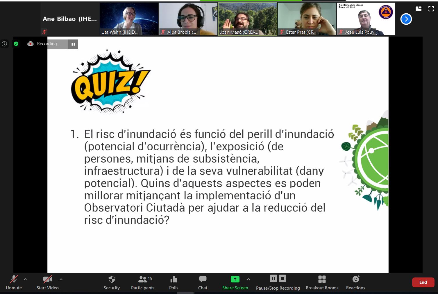 In the Breakout Room entitled ‘ In what ways could a CO help you address your info needs during a flood?’, it was highlighted that a citizen observatory could have an amplifying effect in the community to alert and inform citizens with reliable and consolidated information, avoiding scattered sources. The power of social media channels could be used to spread information and reach more people. Citizen observatories were also perceived to play in planning, presenting a complementary source, while maintaining the role of the official administration. Finally, the Agència Catalana de l’Aigua (ACA) will launch a project called AGORA, to set up a citizen observatory that will inform participants about the main landmarks in a flood episode. In this way, people would be able to monitor specific spots and obtain real-time data. Regarding the question ‘What (else) would you like to get out of a citizen observatory (from a technological and/or social perspective)?, participants deemed it important to have information beyond actual protection plans. For example, early warnings, alert sensors (to anticipate effects by the hour), set up warnings downstream, automatic systems of sirens or lights to translate alerts into real alerts to whoever needs them. According to the current regulation, “The citizen has the right to be informed of the risk he has”. Citizen Observatories were seen to help raise awareness of floods in general and of vulnerable areas in particular, while also counterbalancing fake news. In the third Breakout Room, participants discussed challenging aspects of implementing a citizen observatory. The quality and the veracity of collected information were mentioned as main challenges. In some cases, the information may not be reliable or/and it could be fictitious. To prevent that, control systems were deemed necessary. The discussion also pointed to potentially low levels of participation and engagement, issues with use of technology and training participants, and awareness raising as further challenging aspects. The consensus emerging during the plenary session was that thanks to the citizen observatories, it is possible to have improved access to people who can contribute to reducing risk and vulnerability.